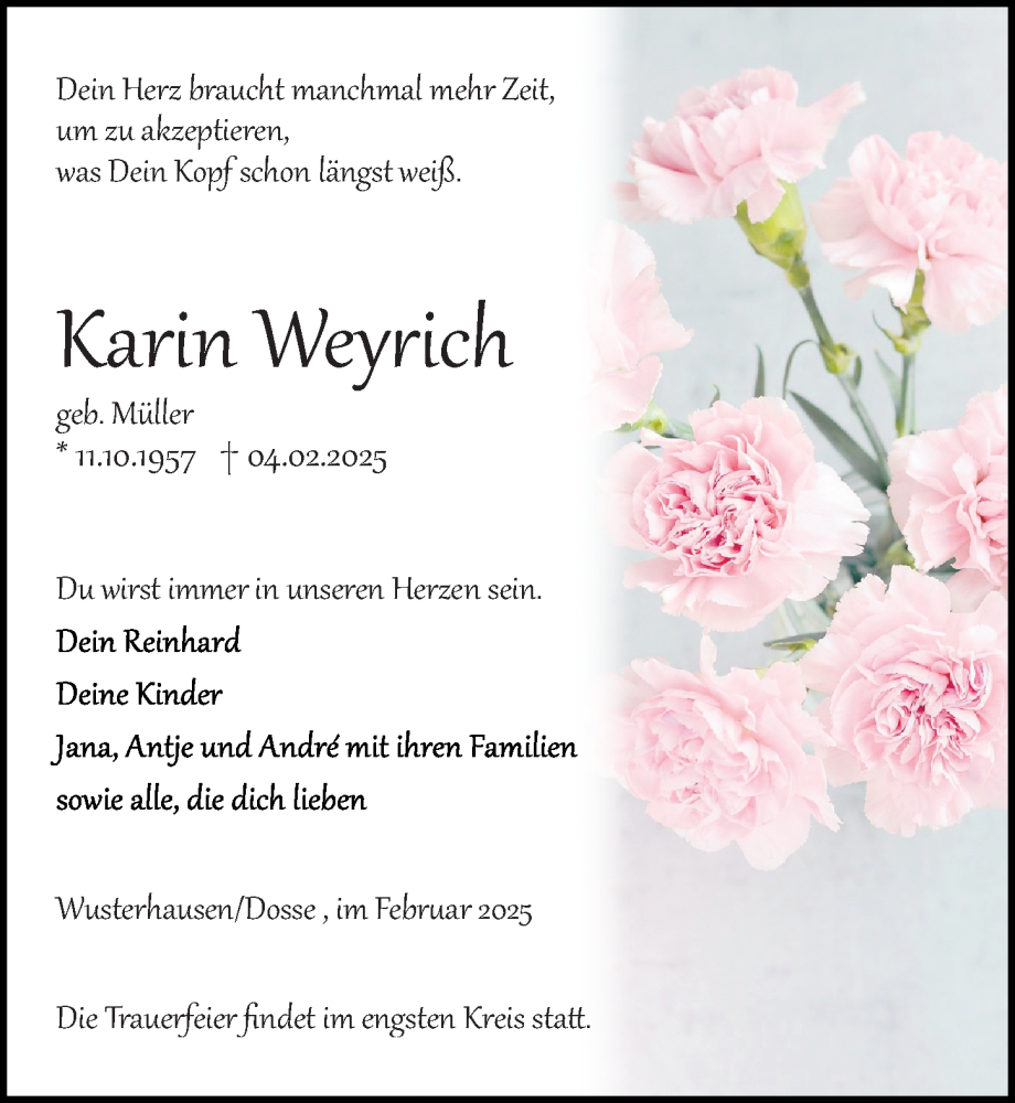 Hier finden Sie alle Traueranzeigen aus der Zeitung, die bisher für Karin Weyrich erschienen sind. Weitere Traueranzeigen, die in der Zeitung erscheinen, werden hier ebenfalls aufgelistet