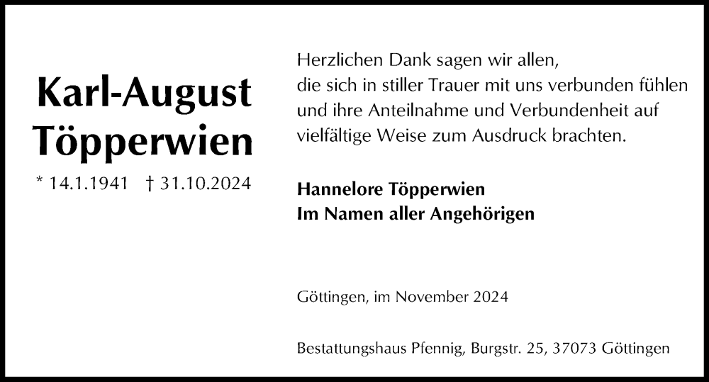 Hier finden Sie alle Traueranzeigen aus der Zeitung, die bisher für Karl-August Töpperwien erschienen sind. Weitere Traueranzeigen, die in der Zeitung erscheinen, werden hier ebenfalls aufgelistet