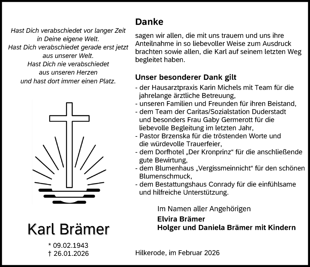 Hier finden Sie alle Traueranzeigen aus der Zeitung, die bisher für Karl Brämer erschienen sind. Weitere Traueranzeigen, die in der Zeitung erscheinen, werden hier ebenfalls aufgelistet