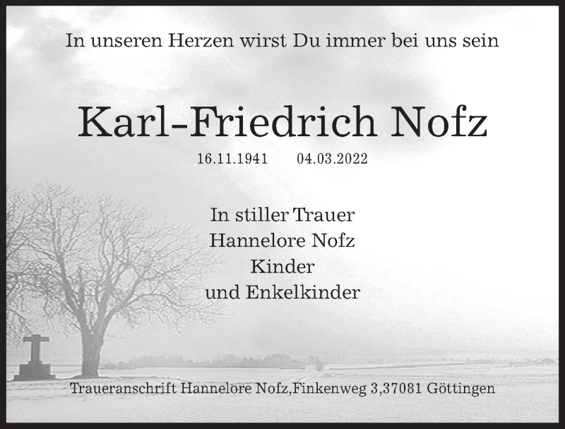 Hier finden Sie alle Traueranzeigen aus der Zeitung, die bisher für Karl-Friedrich Nofz erschienen sind. Weitere Traueranzeigen, die in der Zeitung erscheinen, werden hier ebenfalls aufgelistet