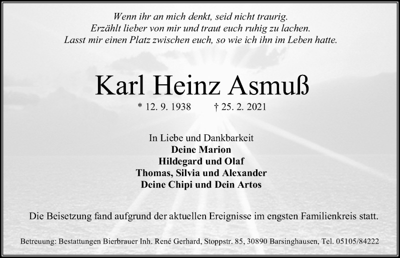 Hier finden Sie alle Traueranzeigen aus der Zeitung, die bisher für Karl Heinz Asmuß erschienen sind. Weitere Traueranzeigen, die in der Zeitung erscheinen, werden hier ebenfalls aufgelistet