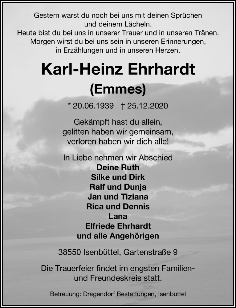 Hier finden Sie alle Traueranzeigen aus der Zeitung, die bisher für Karl-Heinz Ehrhardt erschienen sind. Weitere Traueranzeigen, die in der Zeitung erscheinen, werden hier ebenfalls aufgelistet