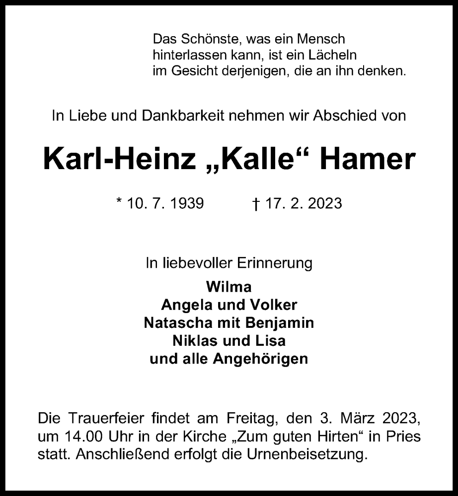 Hier finden Sie alle Traueranzeigen aus der Zeitung, die bisher für Karl-Heinz Hamer erschienen sind. Weitere Traueranzeigen, die in der Zeitung erscheinen, werden hier ebenfalls aufgelistet