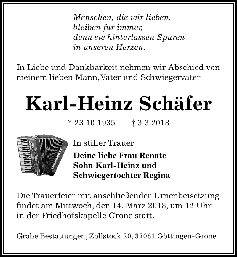 Hier finden Sie alle Traueranzeigen aus der Zeitung, die bisher für Karl-Heinz Schäfer erschienen sind. Weitere Traueranzeigen, die in der Zeitung erscheinen, werden hier ebenfalls aufgelistet