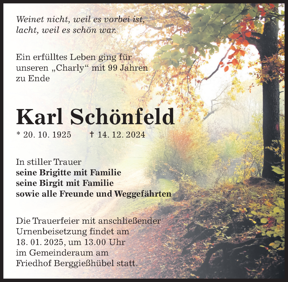 Hier finden Sie alle Traueranzeigen aus der Zeitung, die bisher für Karl Schönfeld erschienen sind. Weitere Traueranzeigen, die in der Zeitung erscheinen, werden hier ebenfalls aufgelistet