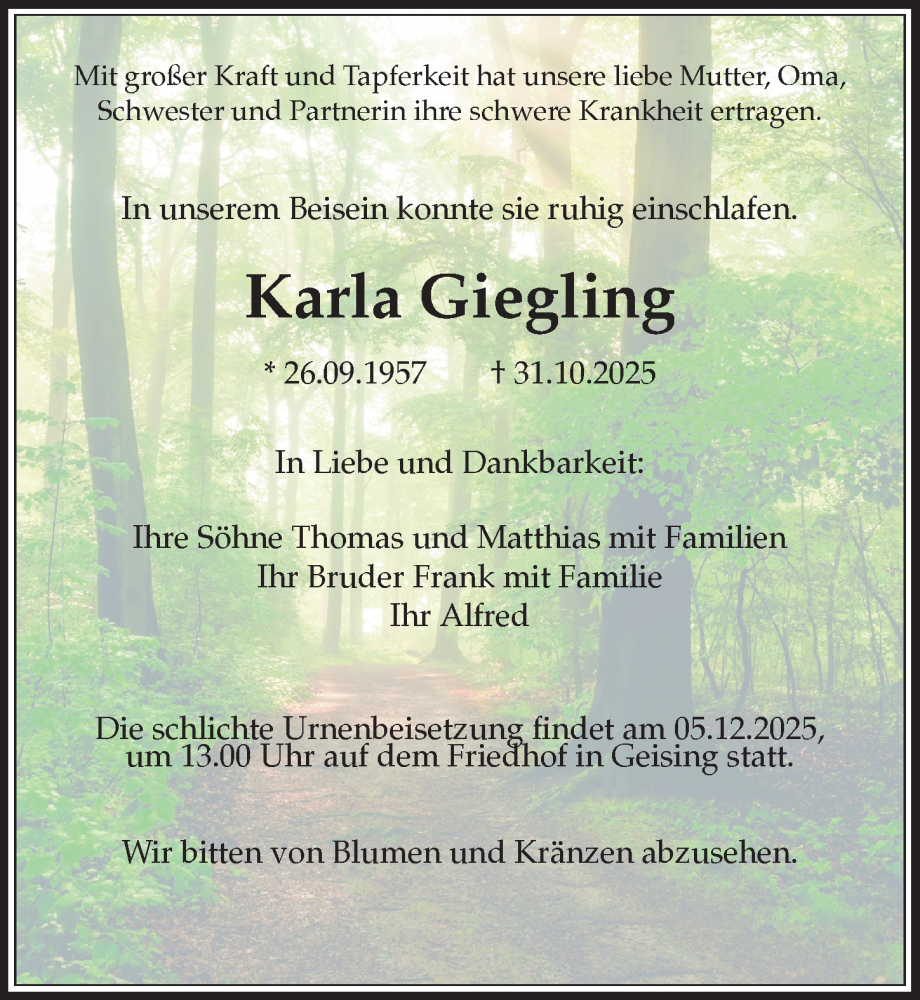 Hier finden Sie alle Traueranzeigen aus der Zeitung, die bisher für Karla Giegling erschienen sind. Weitere Traueranzeigen, die in der Zeitung erscheinen, werden hier ebenfalls aufgelistet