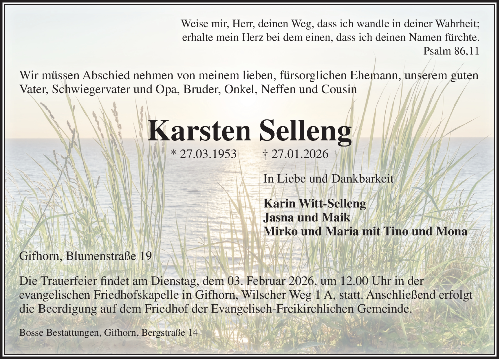 Hier finden Sie alle Traueranzeigen aus der Zeitung, die bisher für Karsten Selleng erschienen sind. Weitere Traueranzeigen, die in der Zeitung erscheinen, werden hier ebenfalls aufgelistet