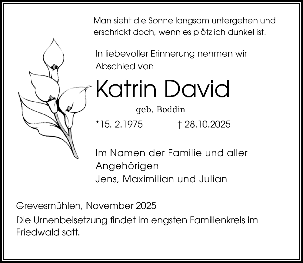 Hier finden Sie alle Traueranzeigen aus der Zeitung, die bisher für Katrin David erschienen sind. Weitere Traueranzeigen, die in der Zeitung erscheinen, werden hier ebenfalls aufgelistet