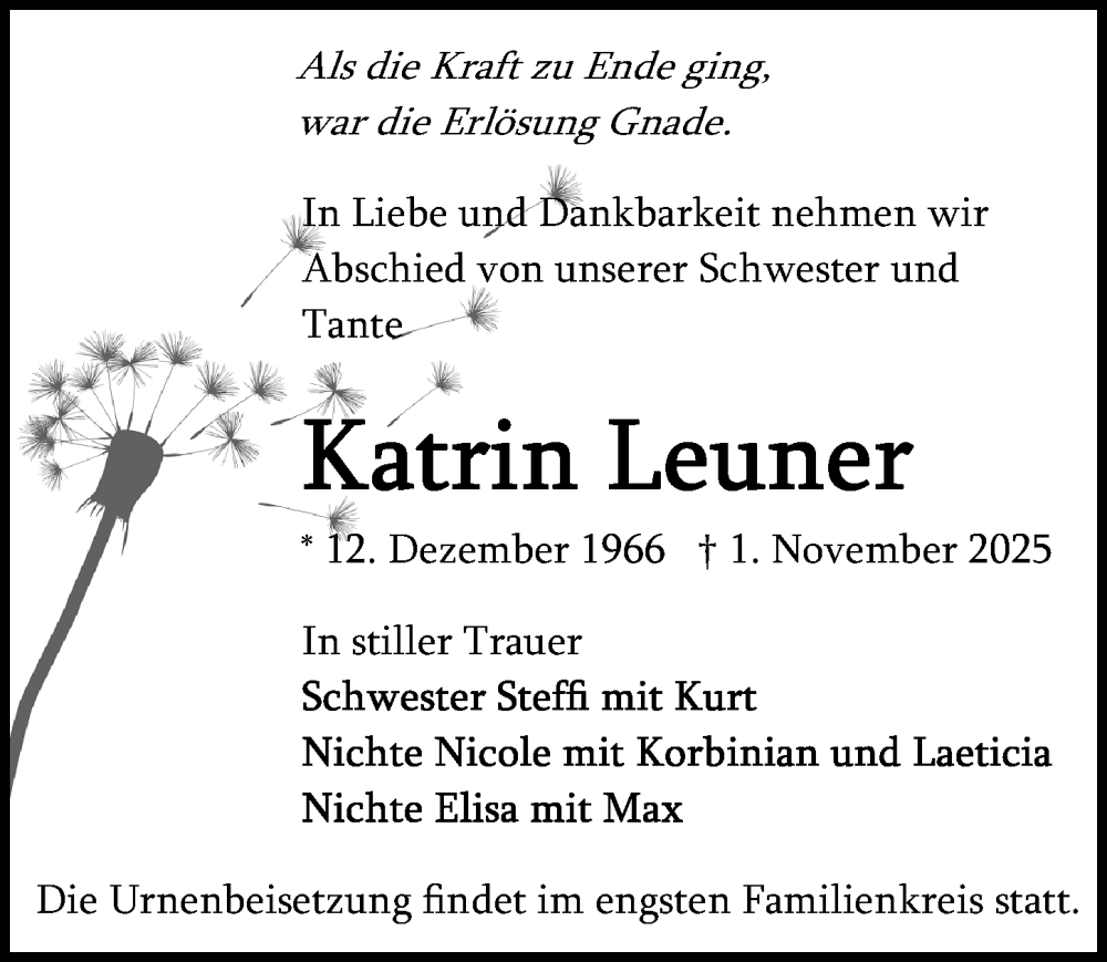Hier finden Sie alle Traueranzeigen aus der Zeitung, die bisher für Katrin Leuner erschienen sind. Weitere Traueranzeigen, die in der Zeitung erscheinen, werden hier ebenfalls aufgelistet