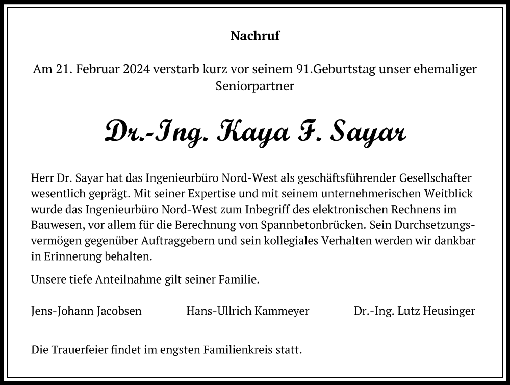 Hier finden Sie alle Traueranzeigen aus der Zeitung, die bisher für Kaya F. Sayar erschienen sind. Weitere Traueranzeigen, die in der Zeitung erscheinen, werden hier ebenfalls aufgelistet
