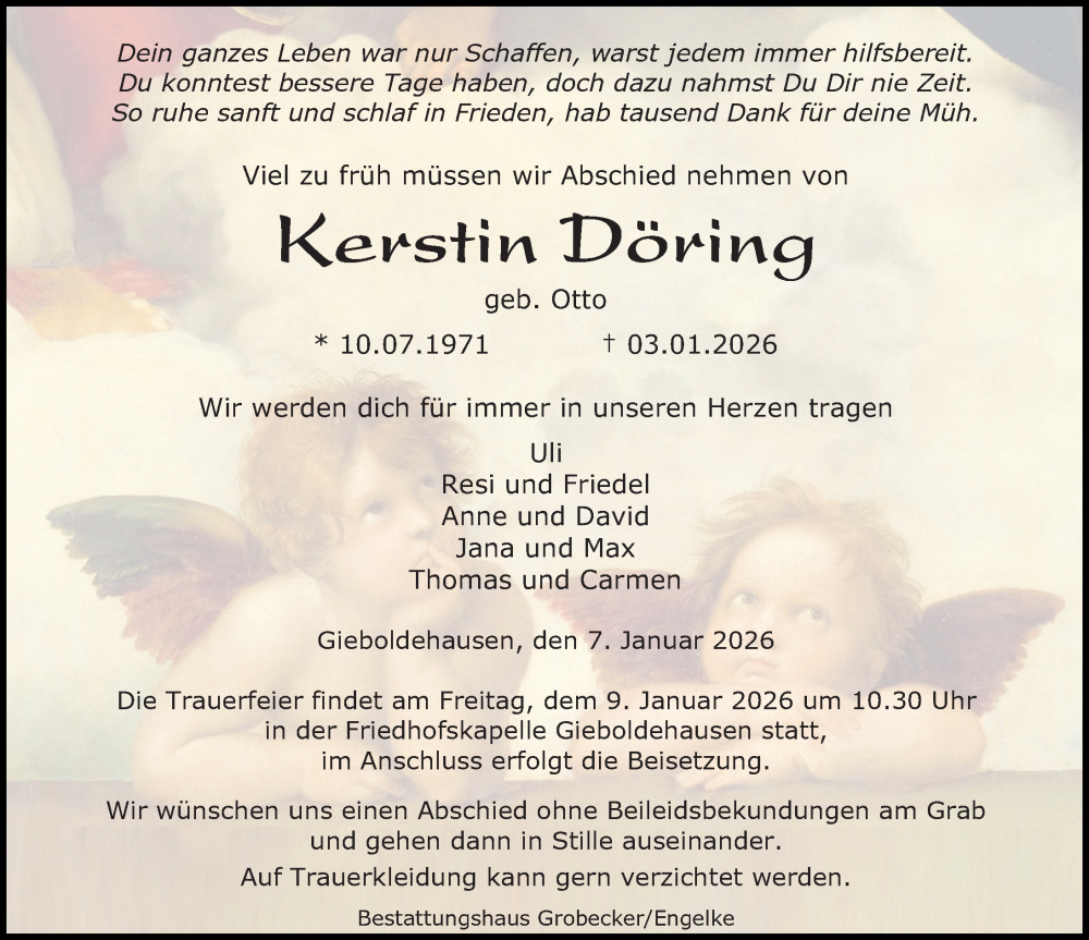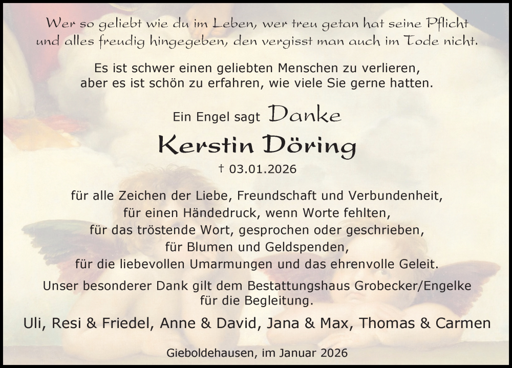 Hier finden Sie alle Traueranzeigen aus der Zeitung, die bisher für Kerstin Döring erschienen sind. Weitere Traueranzeigen, die in der Zeitung erscheinen, werden hier ebenfalls aufgelistet