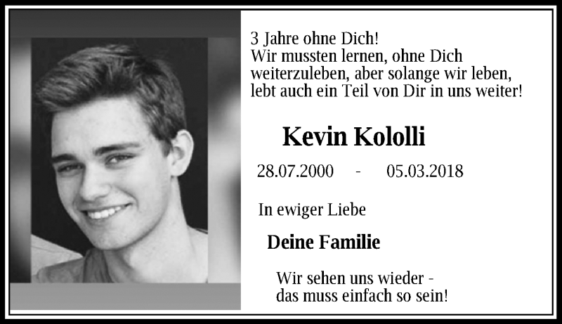 Hier finden Sie alle Traueranzeigen aus der Zeitung, die bisher für Kevin Kololli erschienen sind. Weitere Traueranzeigen, die in der Zeitung erscheinen, werden hier ebenfalls aufgelistet