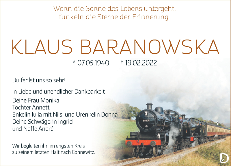 Hier finden Sie alle Traueranzeigen aus der Zeitung, die bisher für Klaus Baranowska erschienen sind. Weitere Traueranzeigen, die in der Zeitung erscheinen, werden hier ebenfalls aufgelistet