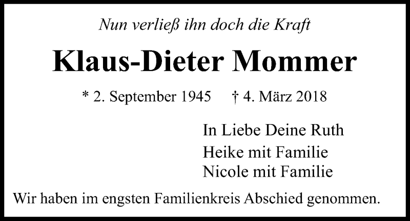 Hier finden Sie alle Traueranzeigen aus der Zeitung, die bisher für Klaus-Dieter Mommer erschienen sind. Weitere Traueranzeigen, die in der Zeitung erscheinen, werden hier ebenfalls aufgelistet