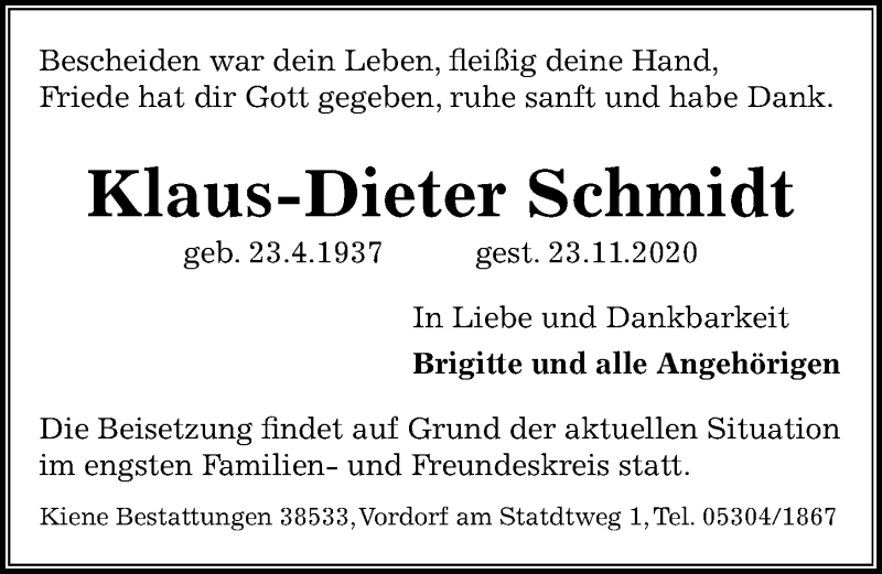 Hier finden Sie alle Traueranzeigen aus der Zeitung, die bisher für Klaus-Dieter Schmidt erschienen sind. Weitere Traueranzeigen, die in der Zeitung erscheinen, werden hier ebenfalls aufgelistet