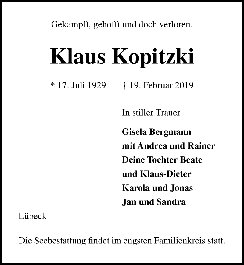 Hier finden Sie alle Traueranzeigen aus der Zeitung, die bisher für Klaus Kopitzki erschienen sind. Weitere Traueranzeigen, die in der Zeitung erscheinen, werden hier ebenfalls aufgelistet