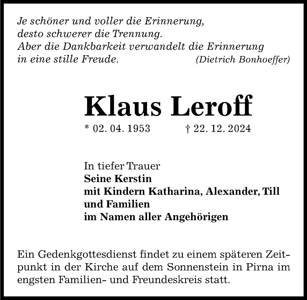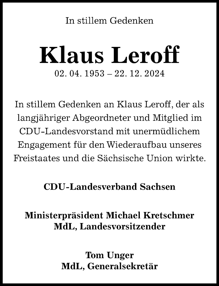 Hier finden Sie alle Traueranzeigen aus der Zeitung, die bisher für Klaus Leroff erschienen sind. Weitere Traueranzeigen, die in der Zeitung erscheinen, werden hier ebenfalls aufgelistet