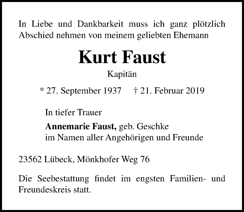 Hier finden Sie alle Traueranzeigen aus der Zeitung, die bisher für Kurt Faust erschienen sind. Weitere Traueranzeigen, die in der Zeitung erscheinen, werden hier ebenfalls aufgelistet