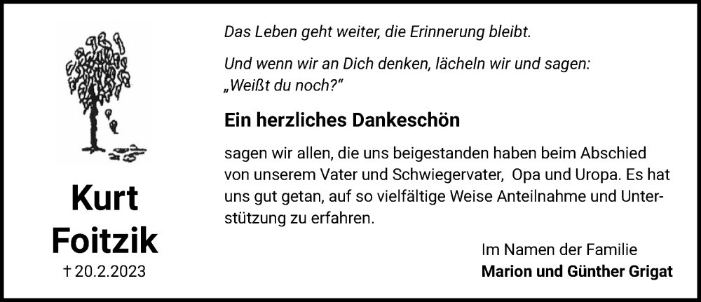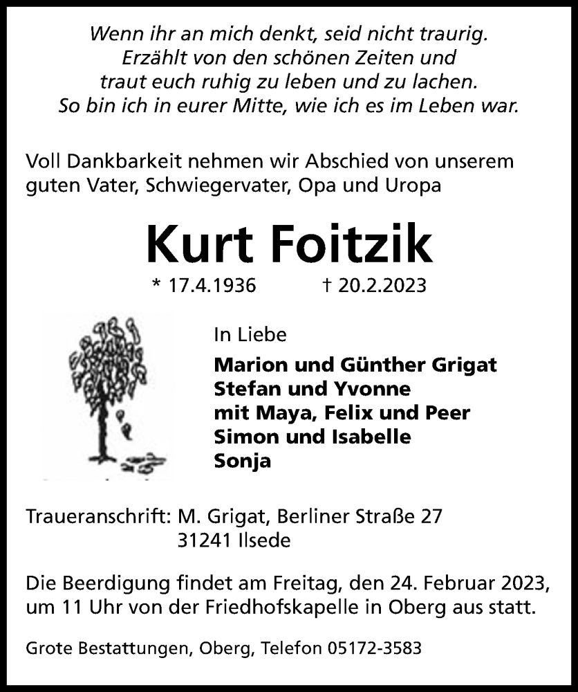 Hier finden Sie alle Traueranzeigen aus der Zeitung, die bisher für Kurt Foitzik erschienen sind. Weitere Traueranzeigen, die in der Zeitung erscheinen, werden hier ebenfalls aufgelistet