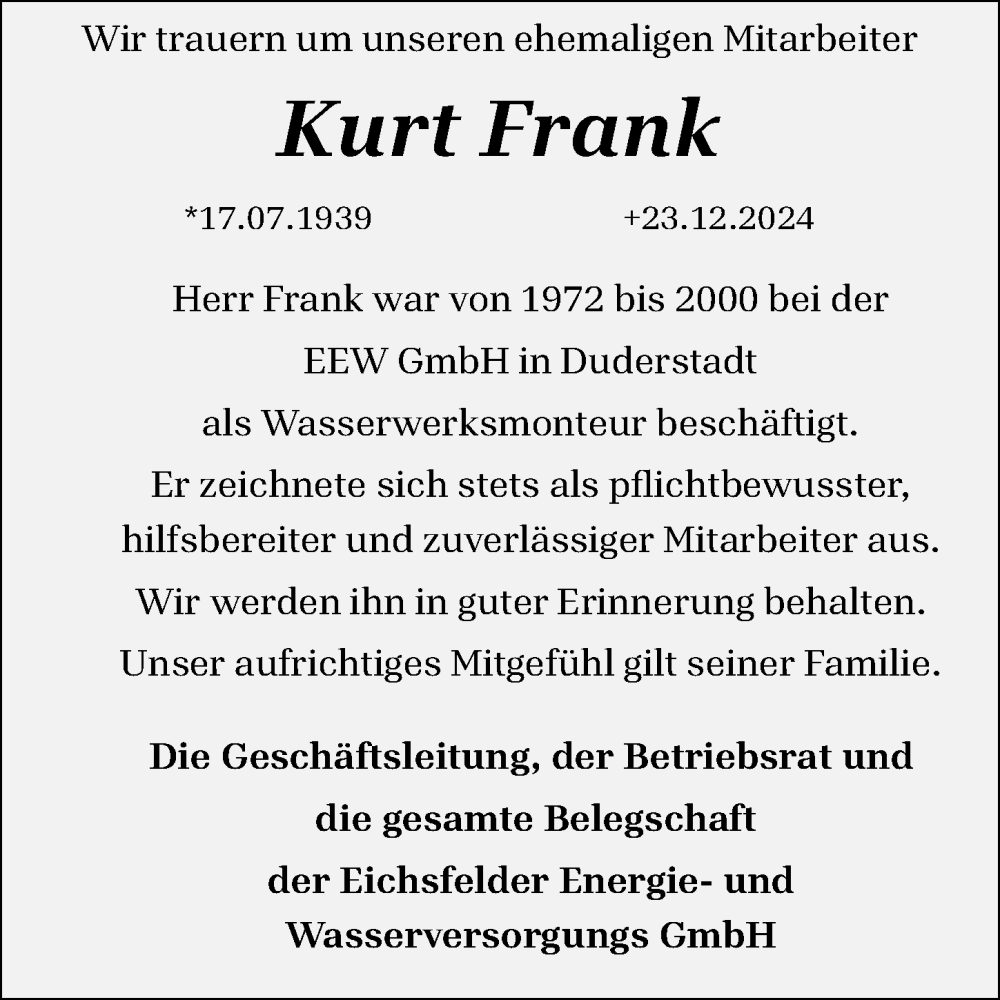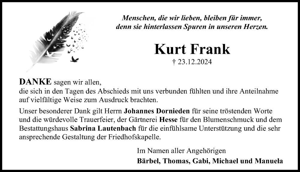 Hier finden Sie alle Traueranzeigen aus der Zeitung, die bisher für Kurt Frank erschienen sind. Weitere Traueranzeigen, die in der Zeitung erscheinen, werden hier ebenfalls aufgelistet