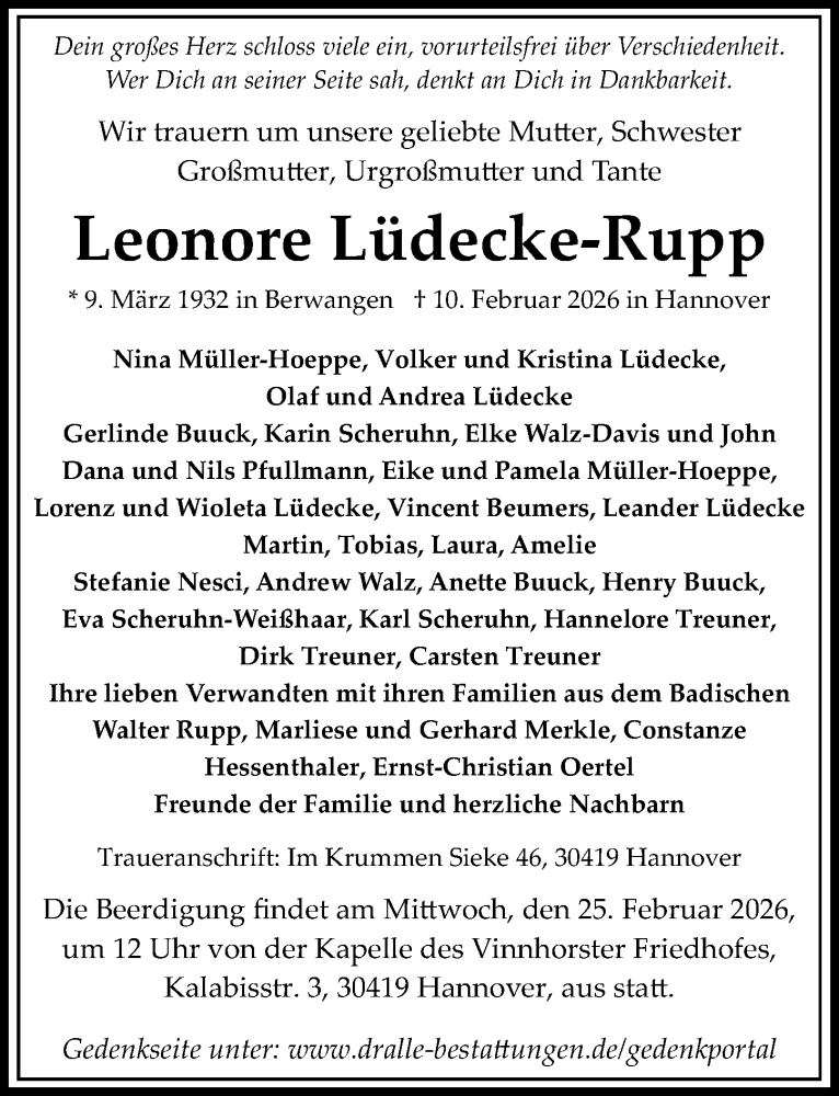 Hier finden Sie alle Traueranzeigen aus der Zeitung, die bisher für Leonore Lüdecke-Rupp erschienen sind. Weitere Traueranzeigen, die in der Zeitung erscheinen, werden hier ebenfalls aufgelistet
