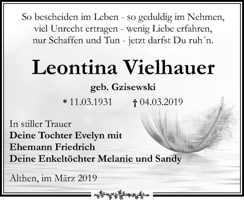 Hier finden Sie alle Traueranzeigen aus der Zeitung, die bisher für Leontina Vielhauer erschienen sind. Weitere Traueranzeigen, die in der Zeitung erscheinen, werden hier ebenfalls aufgelistet