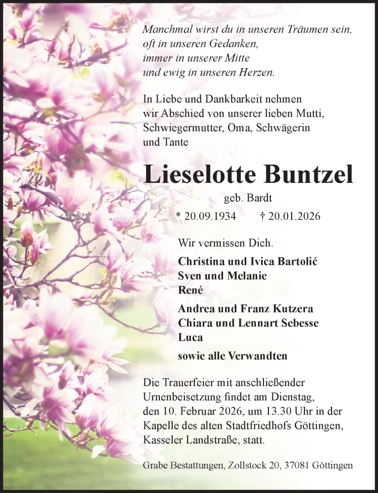 Hier finden Sie alle Traueranzeigen aus der Zeitung, die bisher für Lieselotte Buntzel erschienen sind. Weitere Traueranzeigen, die in der Zeitung erscheinen, werden hier ebenfalls aufgelistet