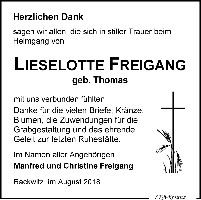 Hier finden Sie alle Traueranzeigen aus der Zeitung, die bisher für Lieselotte Freigang erschienen sind. Weitere Traueranzeigen, die in der Zeitung erscheinen, werden hier ebenfalls aufgelistet