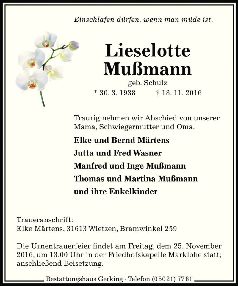 Hier finden Sie alle Traueranzeigen aus der Zeitung, die bisher für Lieselotte Mußmann erschienen sind. Weitere Traueranzeigen, die in der Zeitung erscheinen, werden hier ebenfalls aufgelistet