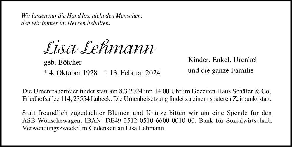 Hier finden Sie alle Traueranzeigen aus der Zeitung, die bisher für Lisa Lehmann erschienen sind. Weitere Traueranzeigen, die in der Zeitung erscheinen, werden hier ebenfalls aufgelistet