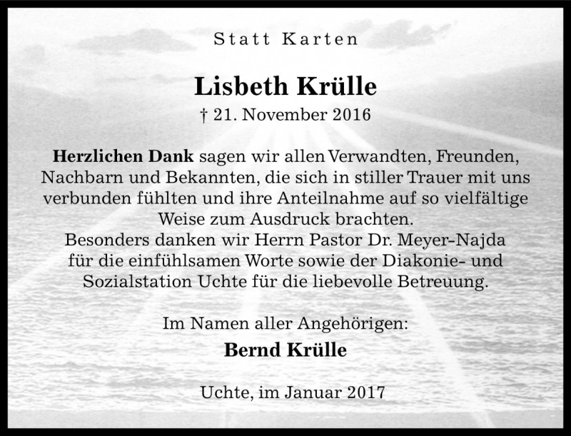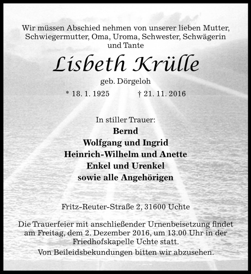 Hier finden Sie alle Traueranzeigen aus der Zeitung, die bisher für Lisbeth Krülle erschienen sind. Weitere Traueranzeigen, die in der Zeitung erscheinen, werden hier ebenfalls aufgelistet