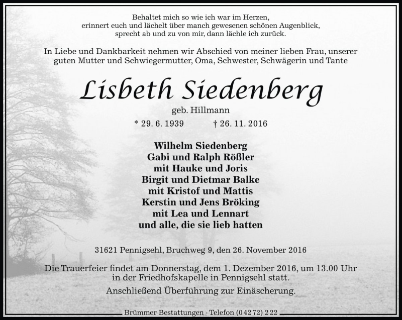 Hier finden Sie alle Traueranzeigen aus der Zeitung, die bisher für Lisbeth Siedenberg erschienen sind. Weitere Traueranzeigen, die in der Zeitung erscheinen, werden hier ebenfalls aufgelistet