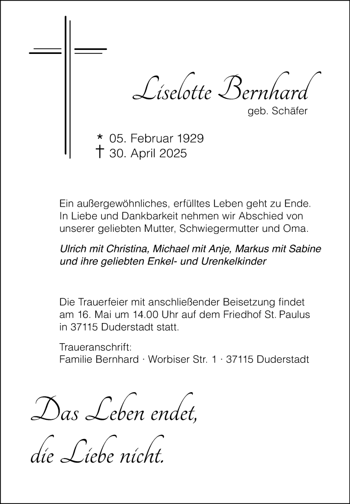 Hier finden Sie alle Traueranzeigen aus der Zeitung, die bisher für Liselotte Bernhard erschienen sind. Weitere Traueranzeigen, die in der Zeitung erscheinen, werden hier ebenfalls aufgelistet