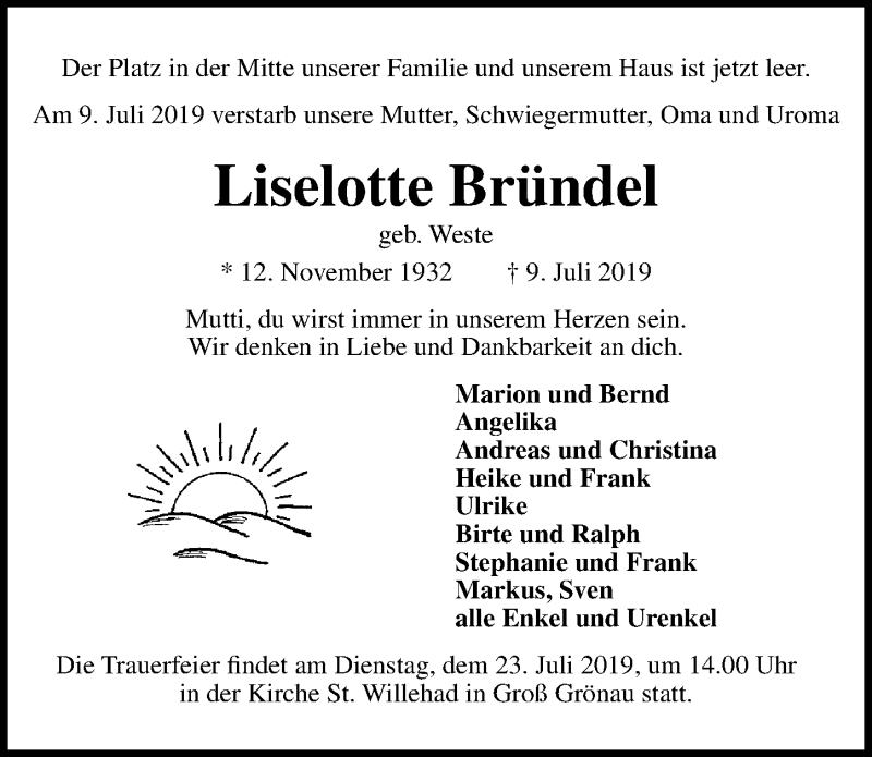 Hier finden Sie alle Traueranzeigen aus der Zeitung, die bisher für Liselotte Bründel erschienen sind. Weitere Traueranzeigen, die in der Zeitung erscheinen, werden hier ebenfalls aufgelistet