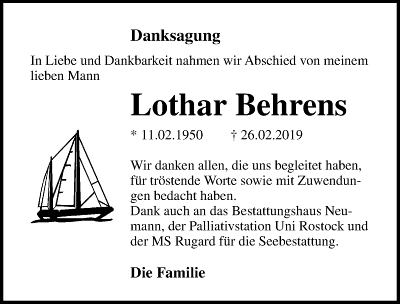 Hier finden Sie alle Traueranzeigen aus der Zeitung, die bisher für Lothar Behrens erschienen sind. Weitere Traueranzeigen, die in der Zeitung erscheinen, werden hier ebenfalls aufgelistet