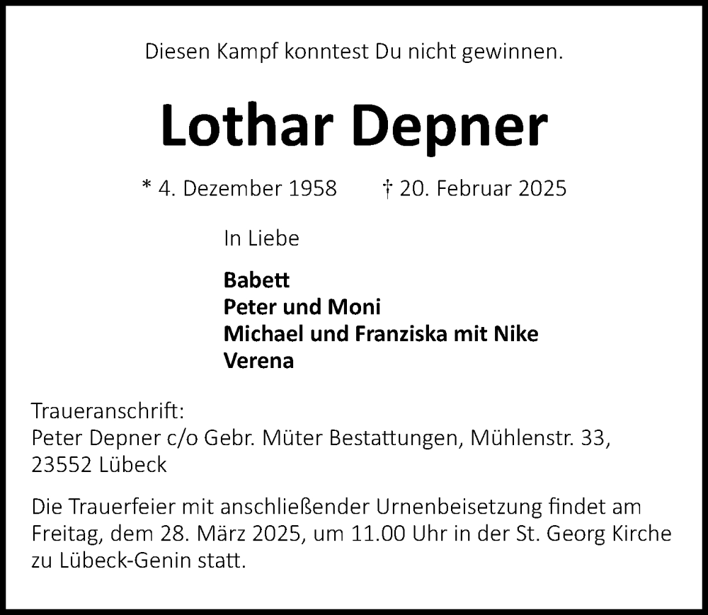 Hier finden Sie alle Traueranzeigen aus der Zeitung, die bisher für Lothar Depner erschienen sind. Weitere Traueranzeigen, die in der Zeitung erscheinen, werden hier ebenfalls aufgelistet