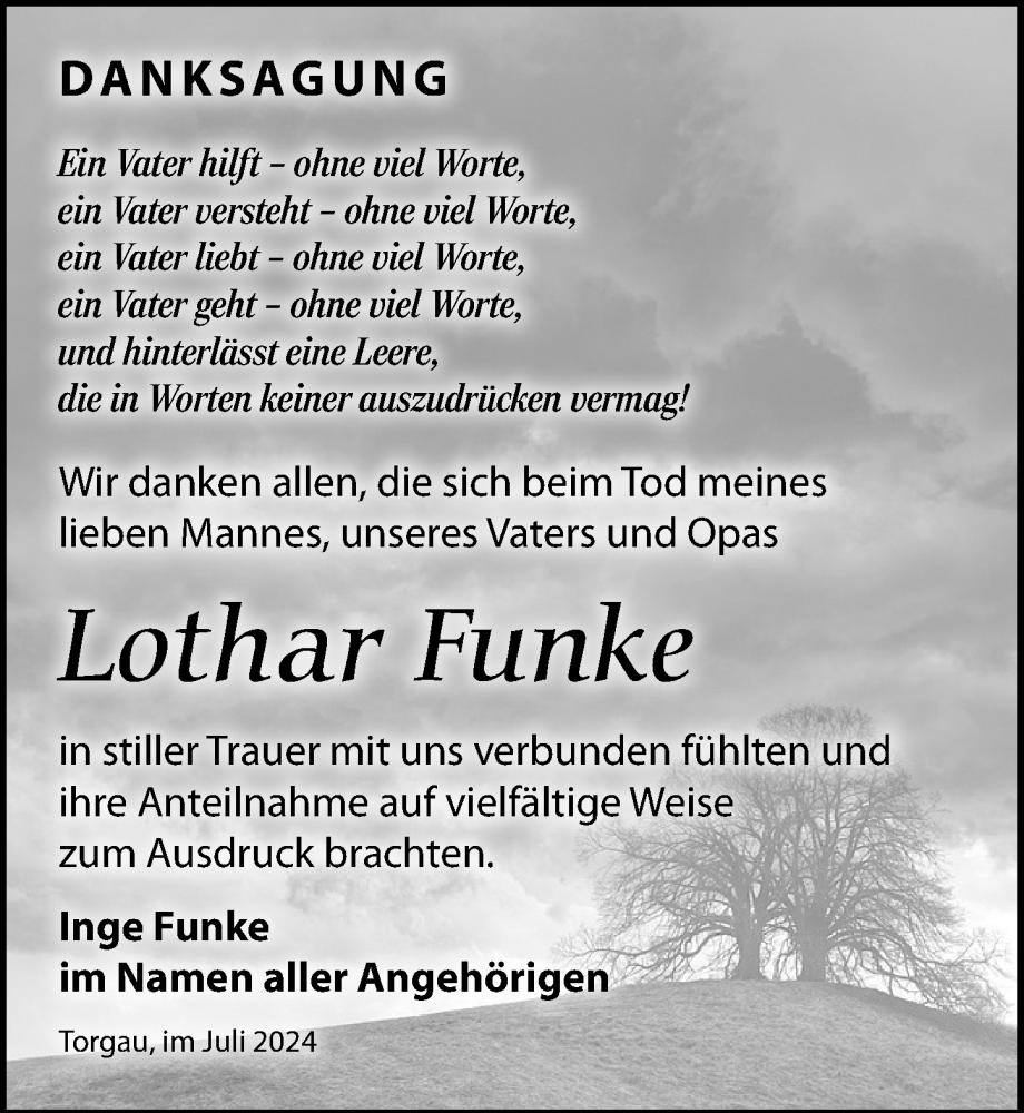 Hier finden Sie alle Traueranzeigen aus der Zeitung, die bisher für Lothar Funke erschienen sind. Weitere Traueranzeigen, die in der Zeitung erscheinen, werden hier ebenfalls aufgelistet