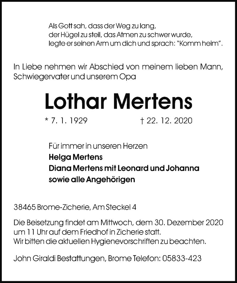 Hier finden Sie alle Traueranzeigen aus der Zeitung, die bisher für Lothar Mertens erschienen sind. Weitere Traueranzeigen, die in der Zeitung erscheinen, werden hier ebenfalls aufgelistet