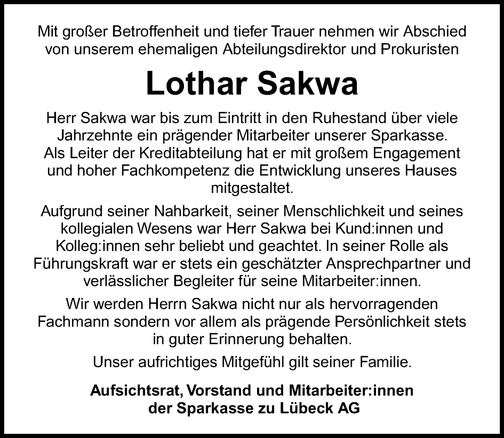 Hier finden Sie alle Traueranzeigen aus der Zeitung, die bisher für Lothar Sakwa erschienen sind. Weitere Traueranzeigen, die in der Zeitung erscheinen, werden hier ebenfalls aufgelistet