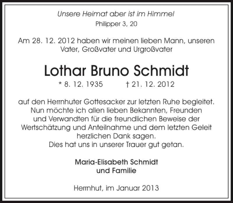 Hier finden Sie alle Traueranzeigen aus der Zeitung, die bisher für Lothar Bruno Schmidt erschienen sind. Weitere Traueranzeigen, die in der Zeitung erscheinen, werden hier ebenfalls aufgelistet