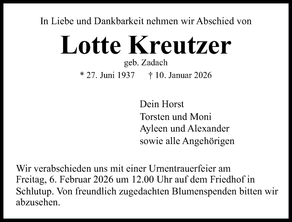 Hier finden Sie alle Traueranzeigen aus der Zeitung, die bisher für Lotte Kreutzer erschienen sind. Weitere Traueranzeigen, die in der Zeitung erscheinen, werden hier ebenfalls aufgelistet