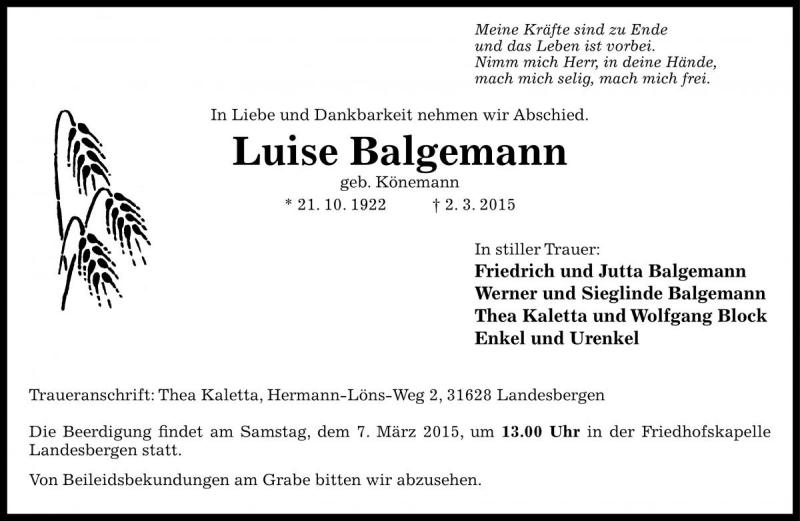 Hier finden Sie alle Traueranzeigen aus der Zeitung, die bisher für Luise Balgemann erschienen sind. Weitere Traueranzeigen, die in der Zeitung erscheinen, werden hier ebenfalls aufgelistet
