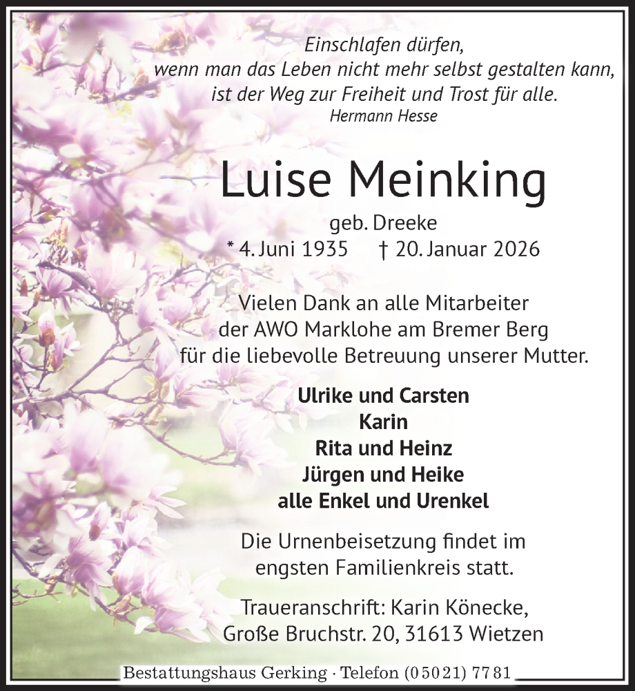 Hier finden Sie alle Traueranzeigen aus der Zeitung, die bisher für Luise Meinking erschienen sind. Weitere Traueranzeigen, die in der Zeitung erscheinen, werden hier ebenfalls aufgelistet