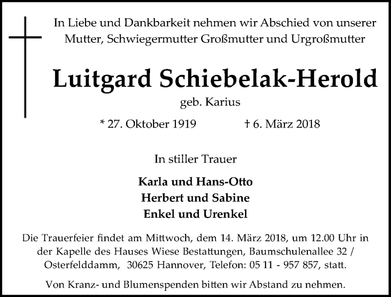 Hier finden Sie alle Traueranzeigen aus der Zeitung, die bisher für Luitgard Schiebelak-Herold erschienen sind. Weitere Traueranzeigen, die in der Zeitung erscheinen, werden hier ebenfalls aufgelistet