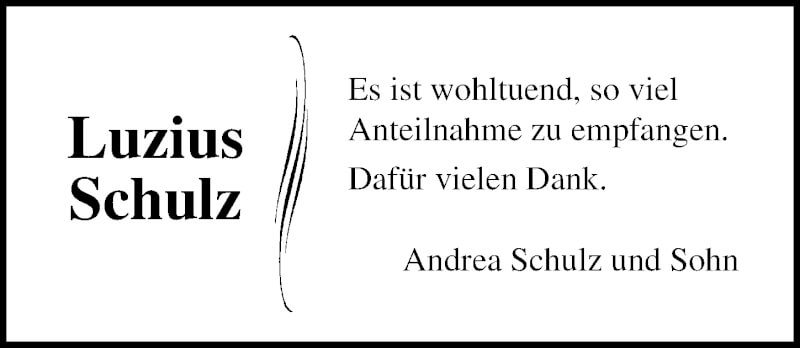 Hier finden Sie alle Traueranzeigen aus der Zeitung, die bisher für Luzius Schulz erschienen sind. Weitere Traueranzeigen, die in der Zeitung erscheinen, werden hier ebenfalls aufgelistet