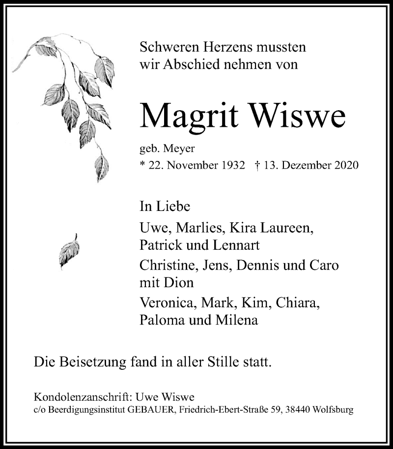 Hier finden Sie alle Traueranzeigen aus der Zeitung, die bisher für Magrit Wiswe erschienen sind. Weitere Traueranzeigen, die in der Zeitung erscheinen, werden hier ebenfalls aufgelistet