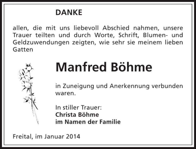 Hier finden Sie alle Traueranzeigen aus der Zeitung, die bisher für Manfred Böhme erschienen sind. Weitere Traueranzeigen, die in der Zeitung erscheinen, werden hier ebenfalls aufgelistet