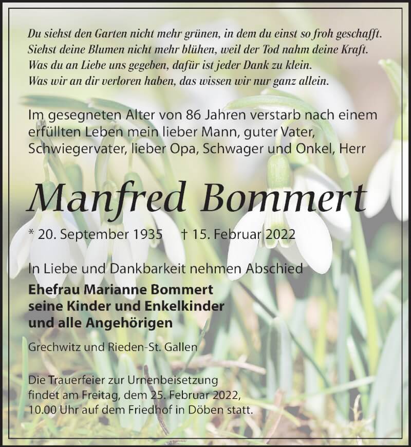 Hier finden Sie alle Traueranzeigen aus der Zeitung, die bisher für Manfred Bommert erschienen sind. Weitere Traueranzeigen, die in der Zeitung erscheinen, werden hier ebenfalls aufgelistet
