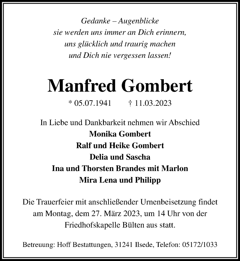 Hier finden Sie alle Traueranzeigen aus der Zeitung, die bisher für Manfred Gombert erschienen sind. Weitere Traueranzeigen, die in der Zeitung erscheinen, werden hier ebenfalls aufgelistet
