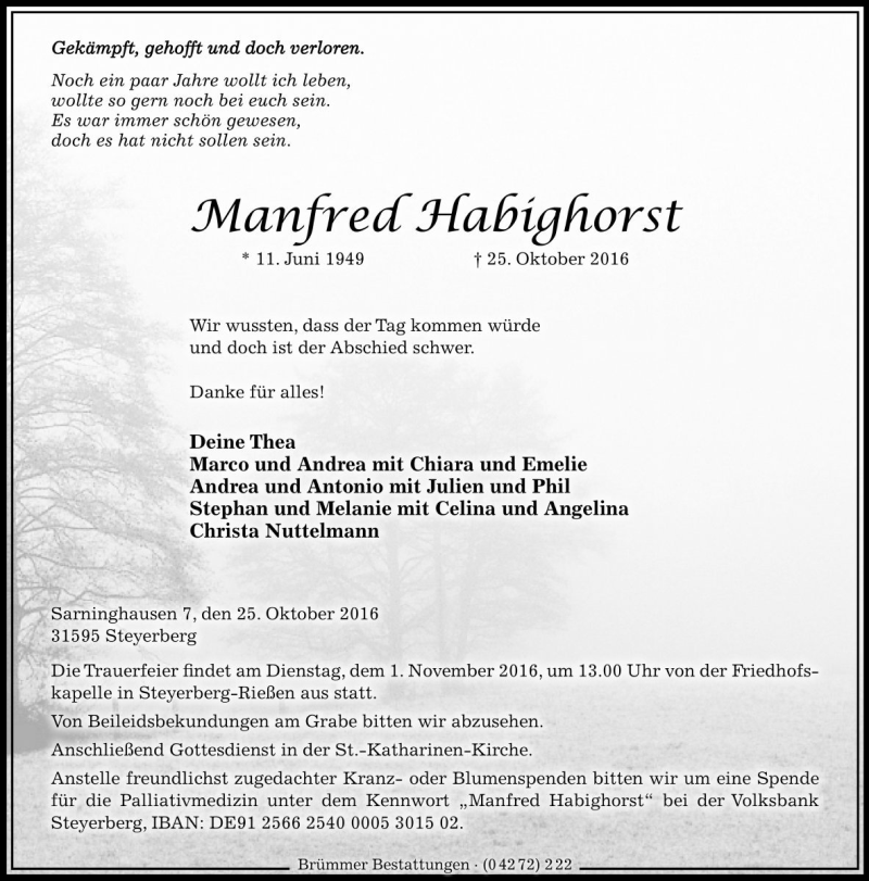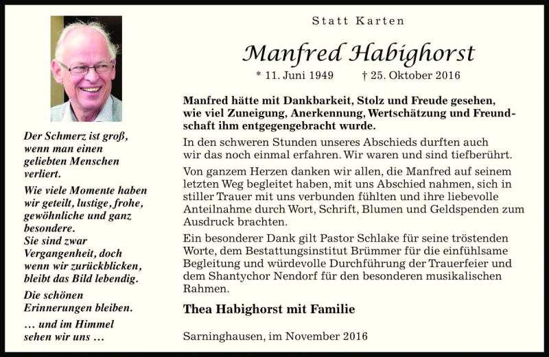 Hier finden Sie alle Traueranzeigen aus der Zeitung, die bisher für Manfred Habighorst erschienen sind. Weitere Traueranzeigen, die in der Zeitung erscheinen, werden hier ebenfalls aufgelistet